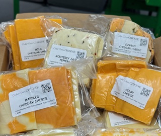 During the Holiday season we do a lot of cutting of 40 pound blocks into 1 pound pieces. The cheese that is left over and doesn’t make a 1 pound piece is what we call TRIM. We sell this cheese at a reduced priced. It’s still the same taste you expect from Cedar Grove Cheese Inc but just not as pretty.